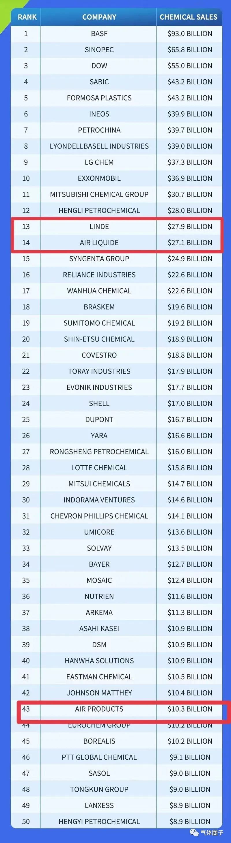 7月25日,美國《化學與工程新聞》(C&EN)公布“2022年全球化工企業50強”。本年度50強收入門檻為89億美元,比去年大幅提升25億美元。氣體行業入選企業依然是氣體三大家,林德,液化空氣和空氣化工。