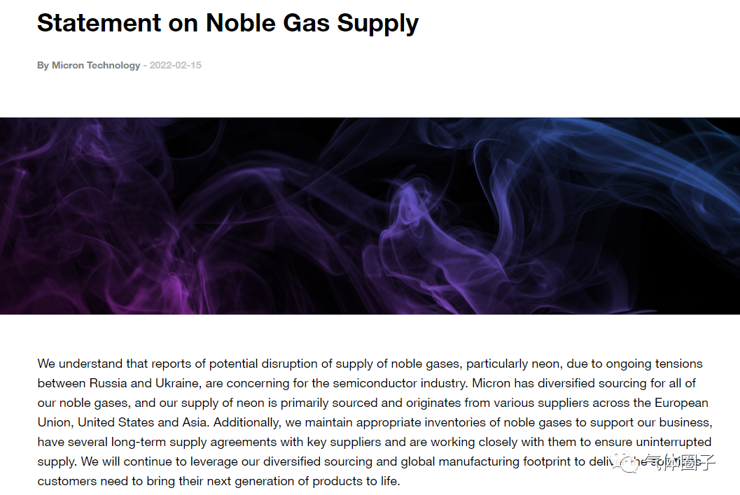 美光官網(wǎng)2月15日發(fā)布最新公告稱:據(jù)我們了解,由于俄羅斯和烏克蘭之間持續(xù)的緊張關(guān)系,惰性氣體(尤其是氖氣)供應(yīng)可能中斷的報道令半導(dǎo)體行業(yè)感到擔(dān)憂。但是,美光公司所有的惰性氣體都是進(jìn)行多元化采購,氖氣供應(yīng)主要來自歐盟、美國和亞洲的各個供應(yīng)商。